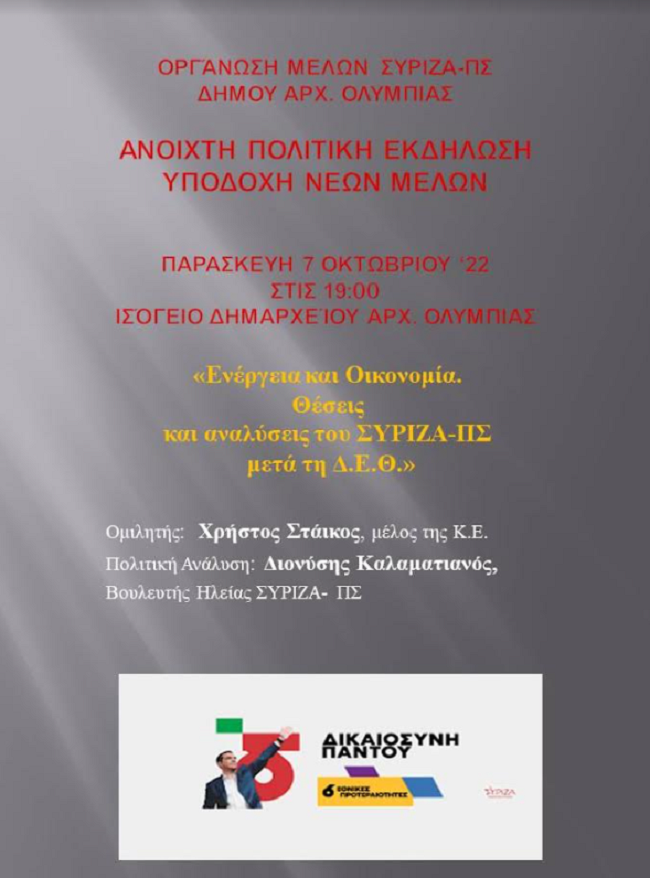 Ανοιχτή πολιτική εκδήλωση και υποδοχή νέων μελών με θέμα: «Ενέργεια και Οικονομία. Θέσεις και αναλύσεις του ΣΥΡΙΖΑ-ΠΣ μετά τη Δ.Ε.Θ.»