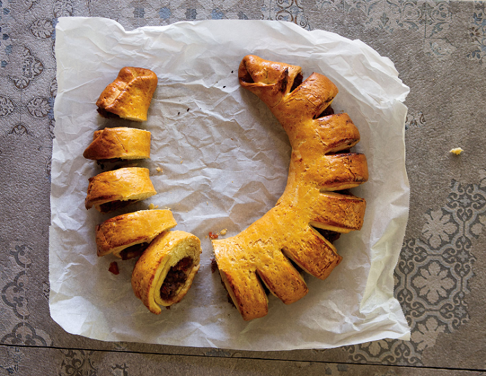 Ανοίγουμε τη ζύμη σε φύλλο οβάλ μήκους 50 εκ. και πλάτους 30εκ. Βάζουμε το chutney ντομάτας κατά μήκος και στο κέντρο και πάνω από αυτό τα ψιλοκομμένα λουκάνικα. Φέρνουμε την κάτω ζύμη και καλύπτουμε τα λουκάνικα. Συνεχίζουμε τυλίγοντας και τοποθετούμε σε ταψί καλυμμένο με λαδόκολλα. Με ένα μαχαίρι κόβουμε το ρολό από το κέντρο προς τις άκρες κάθε 3 εκ περίπου.