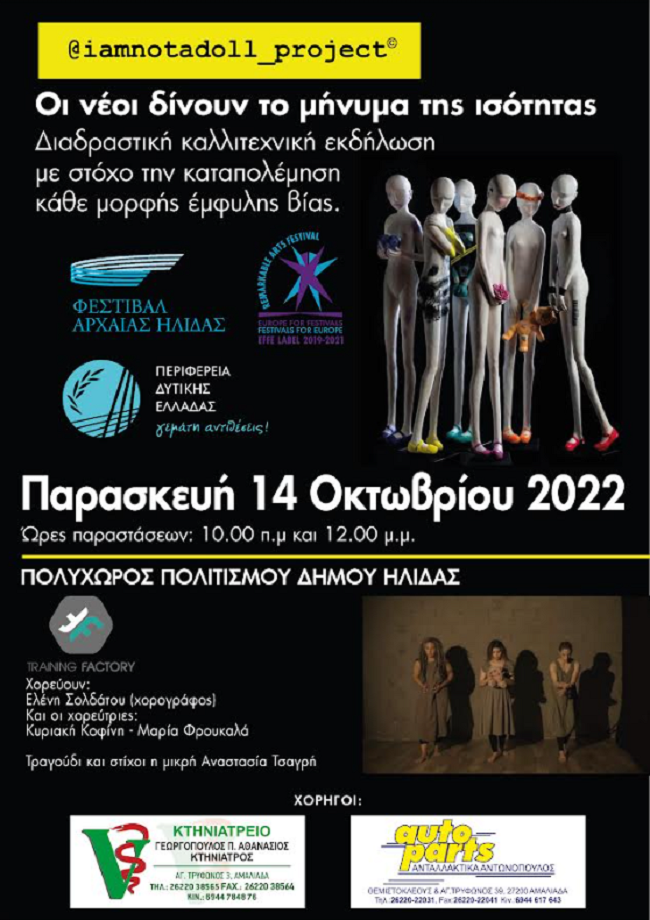 Διαδραστική καλλιτεχνική εκδήλωση με στόχο την καταπολέμηση κάθε μορφής έμφυλης βίας. Βασισμένο στο καλλιτεχνικό εικαστικό project I AM NOT A DOLL, της κ. Ιωάννας Παρασκευά που αφορά τη γυναικεία κακοποίηση και έχει τεθεί υπό την Αιγίδα του Δήμου Ήλιδας και της Περιφέρειας Δυτικής Ελλάδας , που θα πραγματοποιηθεί στον Πολυχώρο Πολιτισμού 14-15-16 Οκτωβρίου 2022 με στόχο να παρακινήσει κυρίως τους νέους να υιοθετήσουν την ιδέα της ουσιαστικής ισότητας μεταξύ των δυο φύλων με την εξάλειψη κάθε μορφή διάκρισης, επιβλαβών πρακτικών, βίας και εκμετάλλευσης των γυναικών και των κοριτσιών.