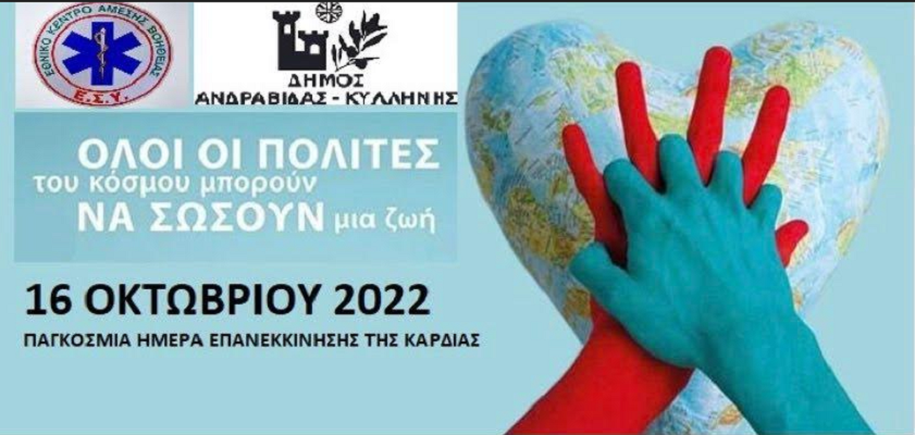 Την Κυριακή 16 Οκτωβρίου, Παγκόσμια Ημέρα Επανεκκίνησης Καρδιάς, ο Δήμος Ανδραβίδας-Κυλλήνης και το ΕΚΑΒ ενώνουν δυνάμεις και διοργανώνουν από κοινού ενημερωτική δράση πρώτων βοηθειών στην Βάρδα.