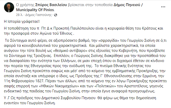Γαστούνη: Σάλος από δημοσίευμα που αναφέρει τον Γεώργιο Σισίνη ως παιδεραστή – Αμεση αντίδραση του Προέδρου του Δ.Σ. που συγκαλεί έκτακτο δημοτικό συμβούλιο