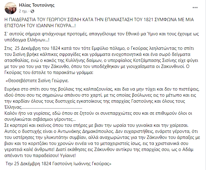Σύμφωνα με αυτό το δημοσίευμα, ο Γεώργιος Σισίνης, κατέφυγε στη Ζάκυνθο κλέβοντας την όμορφη γυναίκα του Αντωνάκη Δημακόπουλου καθώς και την 9χρονη κόρη του, “να το μεταχειριστείς ίσως, εις τα χριστιανικά σου γερατειά καλέ άνθρωπε!”, όπως γράφει χαρακτηριστικά, εκτός των άλλων, αναφέρει η επιστολή του Ιωάννη Γκούρα, την οποία ο κ. Τουτούνης επικαλείται για το κείμενό του.