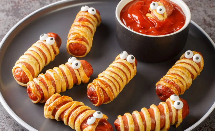 Τοποθετήστε τα λουκάνικα μούμιες σε ένα ταψί που θα έχετε βάλει αντικολλητικό χαρτί.