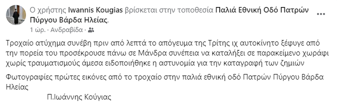 Τροχαίο ατύχημα συνέβη το απόγευμα της Τρίτης όταν ΙΧ αυτοκίνητο, στην παλιά Ε.Ο. Πατρών-Πύργου, ξέφυγε από την πορεία του και προσέκρουσε πάνω σε μάντρα με αποτέλεσμα να καταλήξει σε παρακείμενο χωράφι.