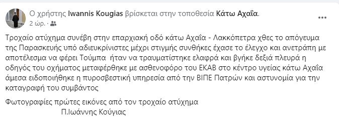 Τροχαίο ατύχημα συνέβη στην επαρχιακή οδό κάτω Αχαΐα – Λακκόπετρα χθες Παρασκευή το απόγευμα, υπό αδιευκρίνιστες μέχρι στιγμής συνθήκες. Αυτοκίνητο έχασε το έλεγχο και ανετράπη με αποτέλεσμα να τραυματιστεί ελαφρά η οδηγός του οχήματος, η οποία μεταφέρθηκε με ασθενοφόρο του ΕΚΑΒ στο κέντρο υγείας Κάτω Αχαΐας.
