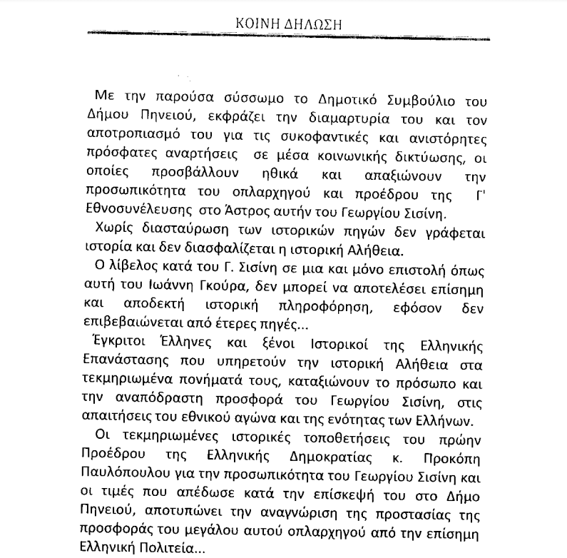 Ενα δημοσίευμα, προ ημερών, το οποίο ανέφερε τον Γεώργιο Σισίνη ως παιδεραστή, είχε προκαλέσει σάλο στην Γαστούνη. Ο Πρόεδρος του δημοτικού Συμβουλίου Πηνειού αντέδρασε άμεσα και μαζί με τον δήμαρχο Ανδρέα Μαρίνο και τους επικεφαλής των παρατάξεων έφτιαξαν κοινή δήλωση, με την οποία εκφράζουν την διαμαρτυρία τους και τον αποτροπιασμό τους για τις συκοφαντικές και ανιστόρητες αναρτήσεις.
