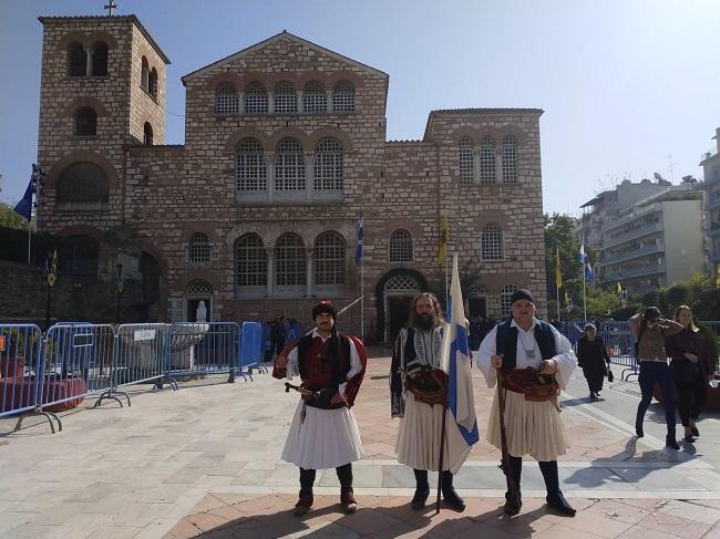 Ανήμερα της Εθνικής Επετείου της 28ης Οκτωβρίου 1940, σύσσωμη η επταμελής αντιπροσωπεία του Συλλόγου μας έλαβε μέρος στη μεγαλειώδη στρατιωτική παρέλαση στη λεωφόρο Μεγάλου Αλεξάνδρου με μοραΐτικες φορεσιές και αυθεντικά άρματα του 1821 και με τις πολεμικές σημαίες του Θεόδωρου Κολοκοτρώνη και της Φιλικής Εταιρείας, αντίστοιχα. Πλαισιωμένη από τους αναβιωτές της Παμμακεδονικής Ένωσης Μακεδονικού Αγώνα Ελλάδος – Αυστραλίας, από τον Λάμπρο Κατσώνη και την Μπαλακλάβα και τον Ιερό Λόχο του Αλέξανδρου Υψηλάντη , μέχρι τους Εύζωνες του 1912-1913 και τα αήττητα Συντάγματα Ευζώνων 1919-1922 του 1/38 και 5/42 της Μικράς Ασίας, τον Σύλλογο Κρητών Δήμου Παύλου Μελά και τους «Κρηταγενείς Μακεδονίας», και φυσικά , την Π.Ε.Ο.Φ Θεσσαλονίκης παρέλασε σε άψογο σχηματισμό με αγέρωχο ύφος και υψηλό πατριωτικό φρόνημα ενώπιον της πολιτειακής, πολιτικής και στρατιωτικής ηγεσίας της χώρας αποσπώντας, μαζί με τους συνοδούς συλλόγους, τον θαυμασμό τους, αλλά και τις επευφημίες των χιλιάδων πολιτών που κατέκλυσαν απ’ άκρου εις άκρον τη λεωφόρο Μεγάλου Αλεξάνδρου -και όχι μόνο-, μέχρι το ύψος της Χ.Α.Ν.Θ.