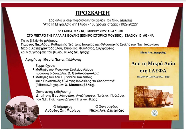 Το βιβλίο του εκπαιδευτικού και συγγραφέα Νίκου Δεμερτζή «Από την Μικρά Ασία στη Γλύφα» που έχει εκδώσει ο Δήμος Πηνειού, παρουσιάζει στην Αθήνα από το κτίριο της Παλαιάς Βουλής, το Σάββατο 12 Νοεμβρίου, ώρα 18.:30 ο Δήμαρχος Πηνειού Ανδρέας Μαρίνος και ο συγγραφέας.