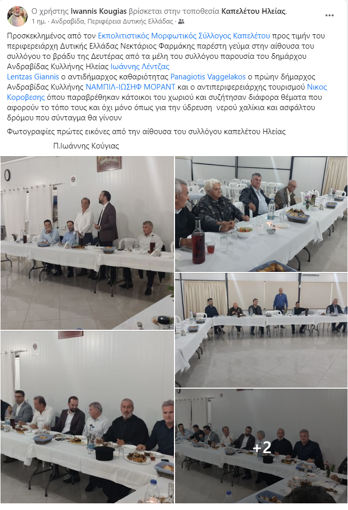 Προσκεκλημένος από τον Εκπολιτιστικός Μορφωτικός Σύλλογος Καπελέτου o περιφερειάρχης Δυτικής Ελλάδας Νεκτάριος Φαρμάκης παρέστη σε γεύμα στην αίθουσα του συλλόγου το βράδυ της Δευτέρας παρουσία του δημάρχου Ανδραβίδας Κυλλήνης Ιωάννη Λέντζα,