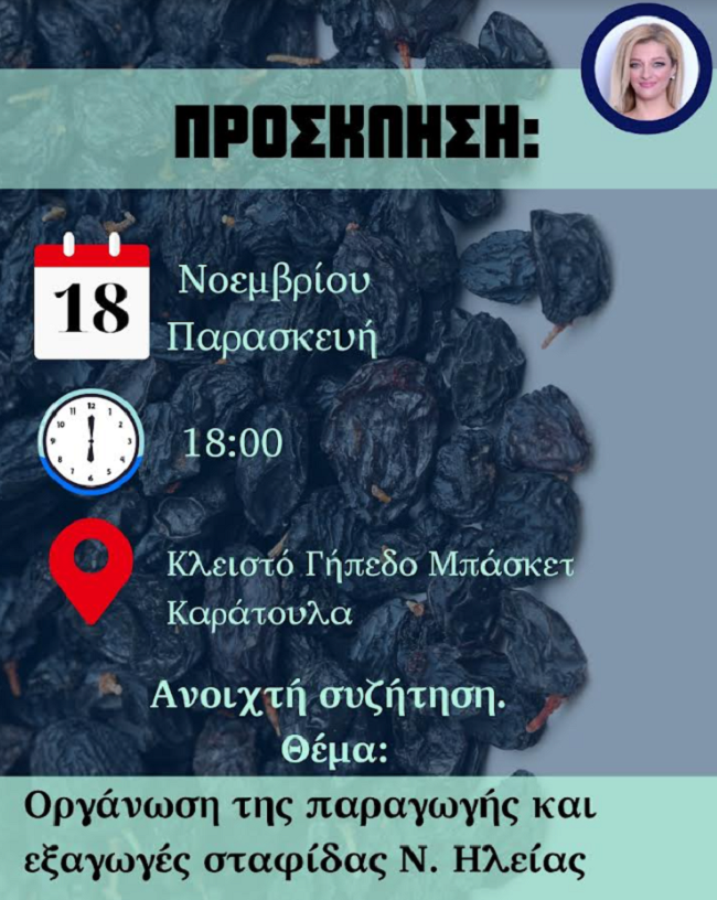 Η Βουλευτής Ν. Ηλείας, Ν.Δ., και Πρόεδρος της Επιτροπής Περιβάλλοντος της Βουλής, Δρ. Διονυσία – Θεοδώρα Αυγερινοπούλου, ενημερώνει ότι την Παρασκευή, 18 Νοεμβρίου στις 18:00, στο κλειστό Γήπεδο Μπάσκετ στο Καράτουλα θα πραγματοποιηθεί η δεύτερη ανοιχτή συζήτηση με τους σταφιδοπαραγωγούς για την οργάνωση της παραγωγής και τις εξαγωγές σταφίδας Ν. Ηλείας.