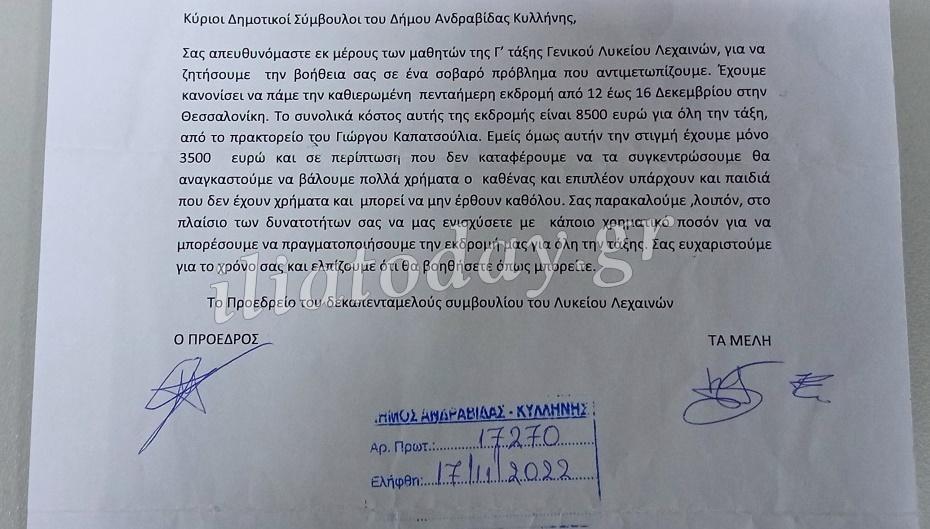 Στην αρχή της συνεδρίασης, ο Γιάννης Λέντζας, εκτός ημερήσιας διάταξης, διάβασε την επιστολή μαθητών της Γ’ Λυκείου, που ζήτησαν οικονομική βοήθεια για την πραγματοποίηση της 5νθήμερης εκδρομής τους.
