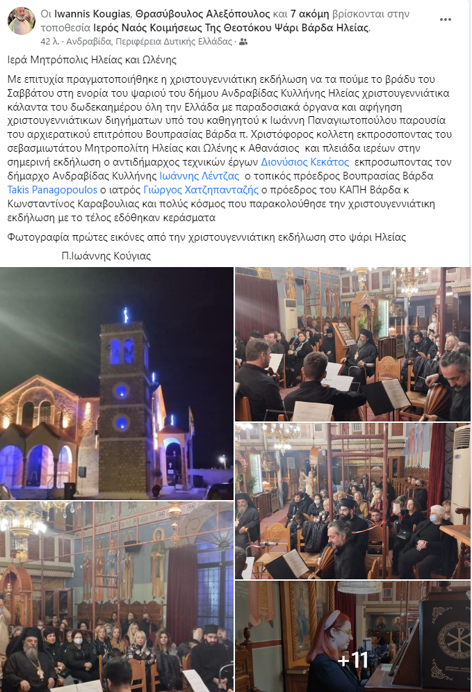 Στην εκδήλωση ακούστηκαν χριστουγεννιάτικα κάλαντα του δωδεκαημέρου απ’ όλη την Ελλάδα με παραδοσιακά όργανα, καθώς και αφήγηση χριστουγεννιάτικων διηγήματων από τον καθηγητή Ιωάννη Παναγιωτόπουλο, παρουσία του αρχιερατικού επιτρόπου Βουπρασίας π. ΧριστόφοροΥ Κολλέτη, ο οποίος εκπροσώπησε τον Μητροπολίτη Ηλείας και Ωλένης κ Αθανάσιο, καθώς επίσης και πλειάδα ιερέων.