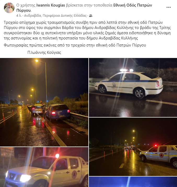 Τροχαίο ατύχημα συνέβη πριν από λεπτά στην εθνική οδό Πατρών Πύργου στο ύψος του Συρμπάνι Βάρδας του δήμου Ανδραβίδας Κυλλήνης.