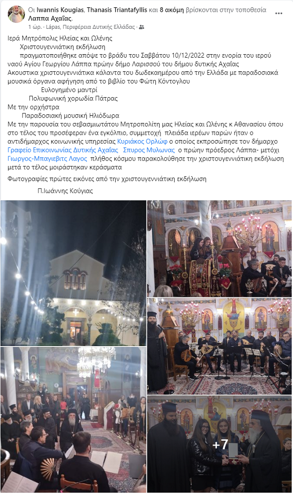 Χριστουγεννιάτικη εκδήλωση πραγματοποιήθηκε απόψε βράδυ του Σαββάτου 10/12/2022 στην ενορία του ιερού ναού Αγίου Γεωργίου Λάππα, πρώην δήμος Λαρισσού.