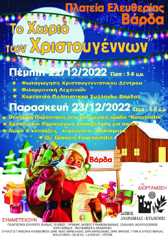 Σε εορταστικό κλίμα βρίσκεται ο Δήμος Ανδραβίδας-Κυλλήνης με τις Χριστουγεννιάτικες εκδηλώσεις να συνεχίζονται. Αύριο, Πέμπτη 22 Δεκεμβρίου, στις 17:00, θα πραγματοποιηθεί η Φωταγώγηση του Χριστουγεννιάτικου Δέντρου στη Βάρδα, η οποία θα σημάνει και την έναρξη την διήμερων εκδηλώσεων του Χωριού των Χριστουγέννων στην πλατεία Ελευθερίας της πόλης.