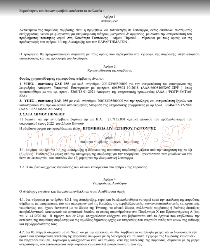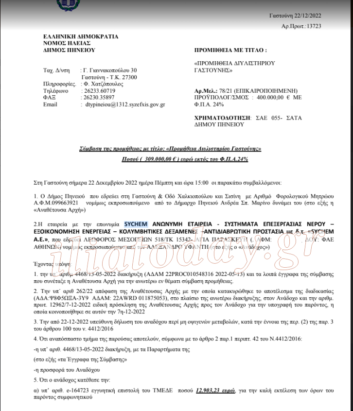 Σήμερα στην αίθουσα του Δημοτικού Συμβουλίου υπεγράφη από τον Δήμαρχο Πηνειού κ. Ανδρέα Μαρίνο και τον πρόεδρο και διευθύνοντα σύμβουλο της αναδόχου εταιρείας «SYCHEM Α.Ε» κ. Αλέξανδρο Υφαντή η σύμβαση για εγκατάσταση και λειτουργία μονάδας επεξεργασίας νερού (προϋπολογισμού 309.000 ευρώ πλέον 74.160 ευρώ ΦΠΑ ) σε ιδιόκτητο οικόπεδο του Δήμου δίπλα στον υδατόπυργο Γαστούνης. Να σημειωθεί ότι οι προεργασίες στο οικόπεδο ήδη έχουν ξεκινήσει.