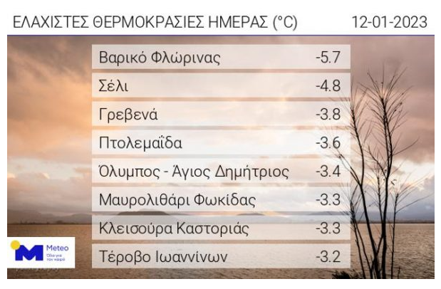 Σύμφωνα με το meteo, παγετός σημειώθηκε στα βόρεια και κεντρικά ηπειρωτικά τις πρωινές ώρες της Πέμπτης 12/01 με τη χαμηλότερη ελάχιστη θερμοκρασία να καταγράφεται στο Βαρικό Φλώρινας με -5,7 °C.