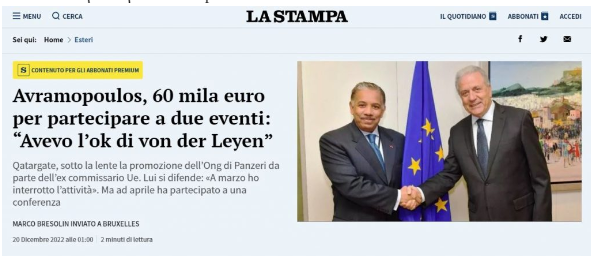 Στο ρεπορτάζ που υπογράφει ο ανταποκριτής της «La Stampa» στις Βρυξέλλες, Marco Bresolin, γίνεται αναφορά στην αμοιβή του Δημήτρη Αβραμόπουλου από την ΜΚΟ «Fight Impunity» του Παντσέρι.