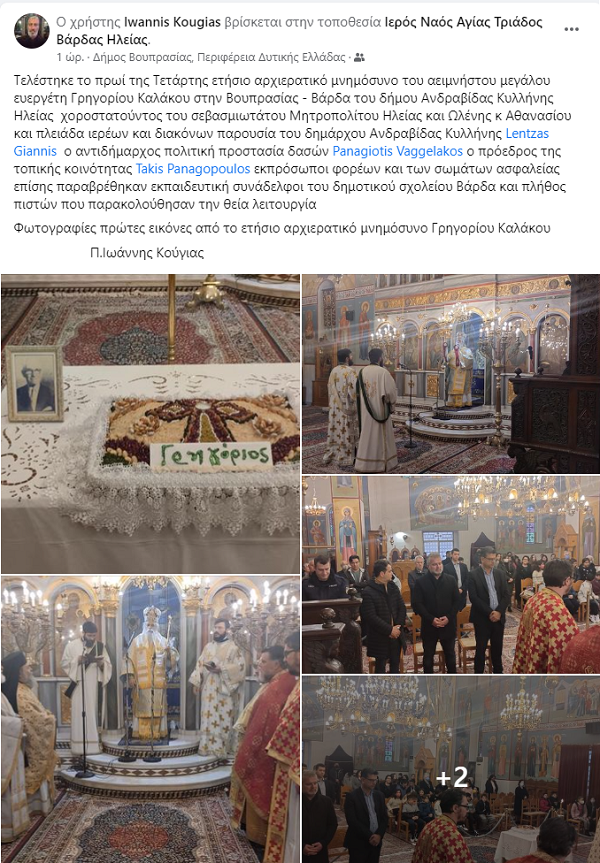 Τελέστηκε το πρωί της Τετάρτης ετήσιο αρχιερατικό μνημόσυνο του αειμνήστου μεγάλου ευεργέτη Γρηγορίου Καλάκου στην Βουπρασίας – Βάρδα του δήμου Ανδραβίδας Κυλλήνης Ηλείας χοροστατούντος του σεβασμιωτάτου Μητροπολίτου Ηλείας και Ωλένης κ.κ.< Αθανασίου και πλειάδα ιερέων και διακόνων.