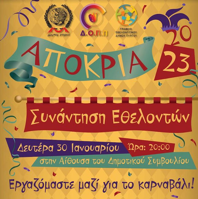Ανοιχτή πρόσκληση προς κάθε πολίτη που επιθυμεί να συμβάλλει στην άρτια διοργάνωση και να γίνει μέρος της μεγάλης γιορτής της Αποκριάς που διοργανώνει ο Δήμος Πύργου και ο ΔΟΠΠ, απευθύνει το Γραφείο Εθελοντισμού.