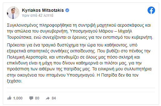 Το μήνυμα του Κυριάκου Μητσοτάκη: «Συγκλονισμένος πληροφορήθηκα τη συντριβή μαχητικού αεροσκάφους και την απώλεια του συγκυβερνήτη, Υποσμηναγού Μάριου – Μιχαήλ Τουρούτσικα, ενώ συνεχίζονται οι έρευνες για τον εντοπισμό του κυβερνήτη.