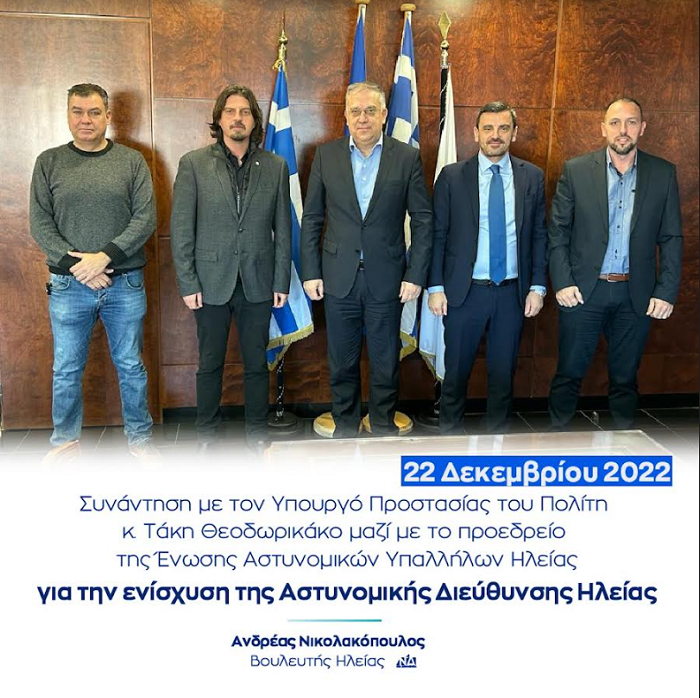 ενίσχυση του προσωπικού της Αστυνομίας στην Ηλεία . Είχε δε για τον σκοπό αυτό συνεργασθεί με την Ένωση Αστυνομικών Υπαλλήλων Ηλείας πραγματοποιώντας και επίσκεψη στον Υπουργό Προστασίας του Πολίτη Τάκη Θεοδωρικάκο μαζί με τον Πρόεδρο Γρηγόρη Κατσώλη και άλλα μέλη της Ένωσης πριν από ένα μήνα.