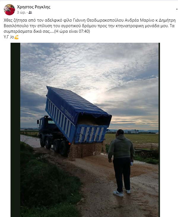 Ο ίδιος ανάρτησε σχετική δημοσίευση στην προσωπική του σελίδα στο facebook, ευχαριστώντας τους Ανδρέα Μαρίνο Δήμαρχο Πηνειού, τον Δημήτρη Βασιλόπουλο αντιδήμαρχο και τον γνωστό επιχειρηματία Γιάννη Θεοδωρακόπουλο [Τζο], ο οποίος και ανέλαβε την χαλικόστρωση.