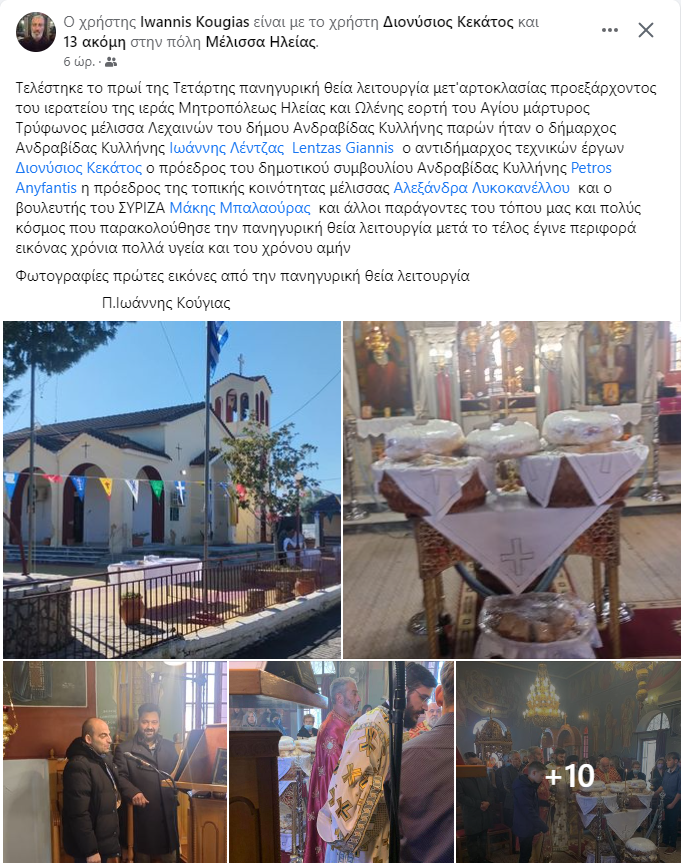 Τελέστηκε σήμερα το πρωί, 1/2, εορτή του Αγίου μάρτυρος Τρύφωνος, πανηγυρική θεία λειτουργία μετ’αρτοκλασίας προεξάρχοντος του ιερατείου της ιεράς Μητροπόλεως Ηλείας και Ωλένης στη Μέλισσα του δήμου Ανδραβίδας Κυλλήνης.