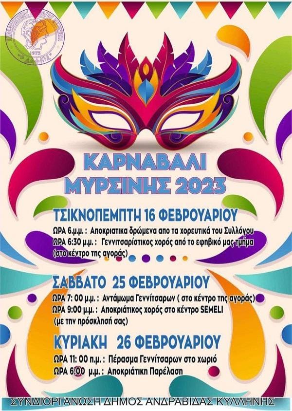 Καρναβάλι και στη Μυρσίνη το προσεχές Σαββατοκύριακο με διοαργάνωση από τον Δήμο Ανδραβίδας-Κυλλήνης! Το Σάββατο 25 Φεβρουαρίου στις 19:00 θα έχουμε Αντάμωμα των Γενίτσαρων στο κέντρο της αγοράς και στις 21:00 αποκριάτικος χορός στο κέντρο SEMELI. Την Κυριακή 26 Φεβρουαρίου στις 11 το πρωί θα έχουμε το Πέρασμα των Γενίτσαρων από το χωριό και στις 18:00 τη μεγάλη καρναβαλική παρέλαση!