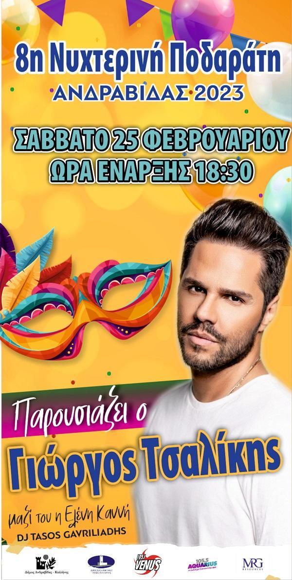 Το Σάββατο 25 Φεβρουαρίου και ώρα 18:30 διοργανώνεται η 8η Νυχτερινή Ποδαράτη Ανδραβίδας από την οργανωτική επιτροπή σε συνεργασία με σχολεία, συλλόγους γονέων και κηδεμόνων, πολιτιστικούς- αθλητικούς συλλόγους και επιχειρήσεις , μεπαρουσιαστή τον έναν και μοναδικό ΓΙΩΡΓΟ ΤΣΑΛΙΚΗ, που υπόσχεται να εκτοξεύσει τη διασκέδαση στα ύψη με το αστείρευτο χιούμορ του και να διασκεδάσει πληρώματα και θεατές.