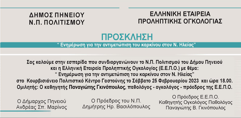 «Ενημέρωση για την αντιμετώπιση του καρκίνου στον Ν.Ηλείας» είναι το θέμα της εσπερίδας που συνδιοργανώνουν το Ν.Π. Πολιτισμού του Δήμου Πηνειού και η Ελληνική Εταιρεία Προληπτικής Ογκολογίας (Ε.Ε.Π.Ο.) το Σάββατο 25 Φεβρουαρίου και ώρα 18.00 στο Κουρβισιάνειο Πολιτιστικό Κέντρο Γαστούνης με ομιλητή τον καθηγητή κ. Παναγιώτη Γκινόπουλο παθολόγο-