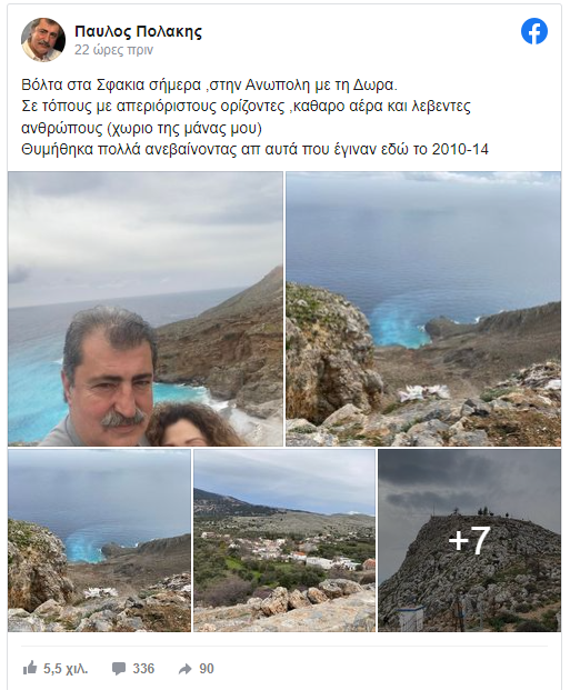 Μάλιστα, ο Παύλος Πολάκης λίγα λεπτά αργότερα επανήλθε με μια νέα σιβυλλική ανάρτηση με φωτογραφίες από τα ψηλά βουνά των Σφακίων, στην Ανώπολη.
