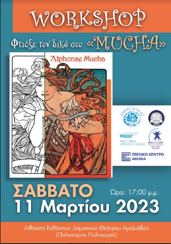 Στο πλαίσιο της συνεργασίας του Δήμου Ήλιδας και του Φεστιβάλ Αρχαίας Ήλιδας με το Τσέχικο Κέντρο Πολιτισμού και τη Πρεσβεία της Τσεχίας, έχει προγραμματιστεί workshop (βιωματικό εργαστήριο) για όλες τις ηλικίες το Σάββατο 11 Φεβρουαρίου και ώρα 17.00μμ στην αίθουσα εκθέσεων του Δημοτικού Θεάτρου Αμαλιάδας, με θέμα «Φτιάξε το δικό σου Μούχα», με γνωστά έργα του Άλφονς Μούχα, ενός από τους πιο σημαντικούς εκπροσώπους της Αρ Νουβώ.