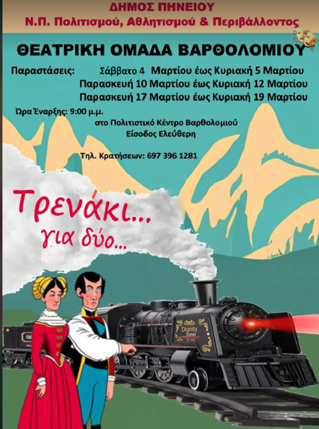 Η θεατρική ομάδα Βαρθολομιού παρουσιάζει την κωμωδία Τρενάκι για ..2, βασισμένο σε μονόπρακτα του Τσέχωφ και σκηνοθετική ματιά του Λάζαρου Κυπριώτη.