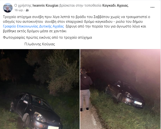 Το ατύχημα συνέβη στον επαρχιακό δρόμο Καγκαδίου-Ριόλο, καθώς ο οδηγός ξέφυγε για άγνωστο λόγο από την πορεία του πέφτοντας σε χαντάκι.