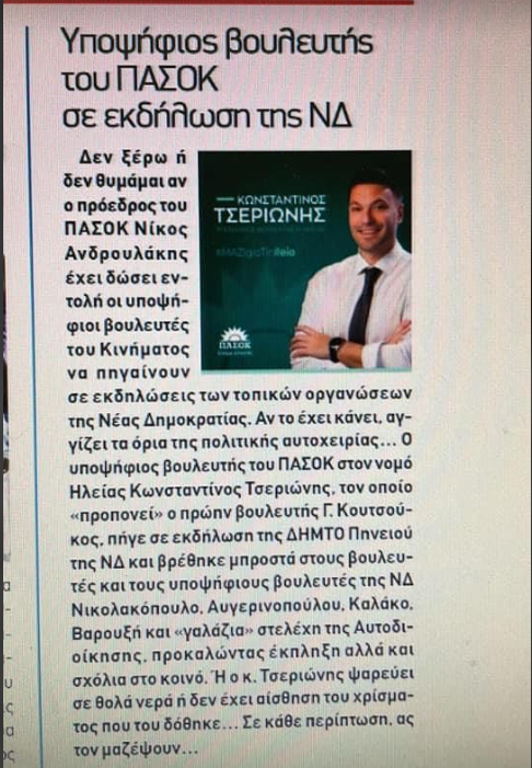 Ντροπή στην εφημερίδα Political η οποία κατέκρινε την παρουσία του σε έναν φιλανθρωπικό καφέ στο My Friend’s Bareatory, τον οποίο ναι μεν διοργάνωσε η Δημ. Τ.Ο. Νέας Δημοκρατίας δήμου Πηνειού όμως παραβρέθηκαν άνθρωποι από όλα τα κόμματα και τους οποίους ευχαριστούμε πολύ!!!