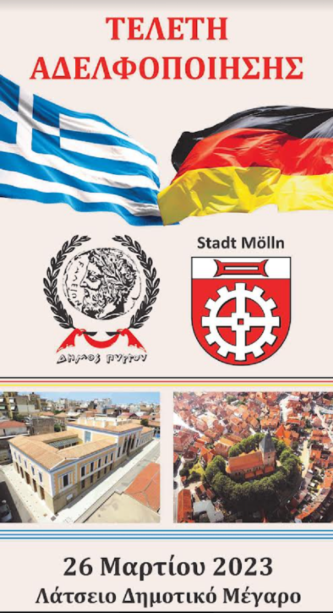 Την Παρασκευή 24/3 το απόγευμα θα υποδεχτεί ο Δήμαρχος Πύργου Παναγιώτης Αντωνακόπουλος την αποστολή της γερμανικής πόλης Mölln, στο γραφείο του στο Λάτσειο Δημοτικό Μέγαρο, εν όψει της Αδελφοποίησης των δύο Δήμων που θα πραγματοποιηθεί στην αίθουσα Συνεδριάσεων του Δημοτικού Συμβουλίου, την Κυριακή 26 Μαρτίου 2023 και ώρα 19.00.