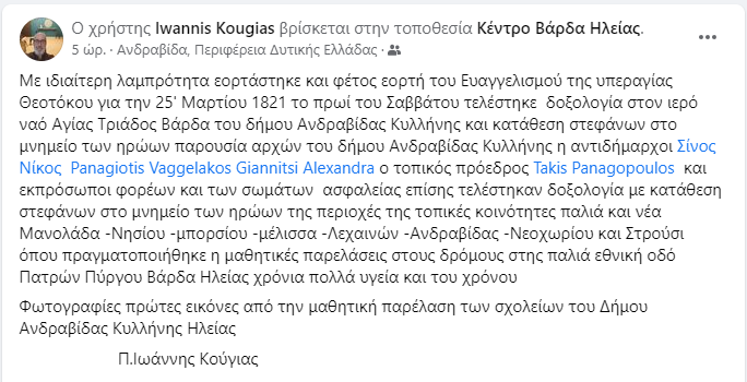 Πραγματοποιήθηκαν με επιτυχία οι εκδηλώσεις για την επέτειο της 25ης Μαρτίου σε Βαρδα, Παλιά και Νέα Μανολάδα, στο Νησί, στο Μπόρσι, στη Μέλισσα, στην Ανδραβίδα, στο Νεοχώρι και στο Στρούσι.