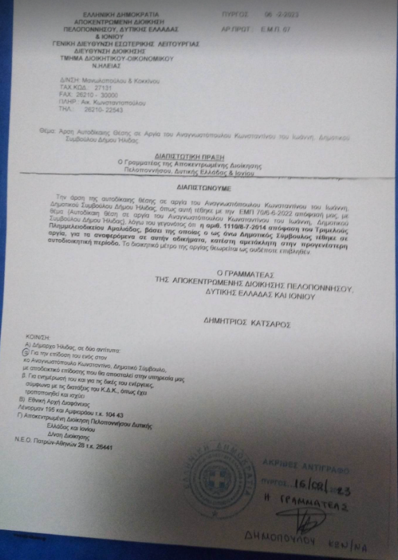 Σύμφωνα με το συγκεκριμένο έγγραφο λόγω της απόφασης του Τριμελούς Πλημμελειοδικείο Αμαλιάδας, βάσει της οποίας τέθηκε σε αργία, για τα αναφερόμενα σε αυτή αδικήματα, κατέστη αμετάκλητη στην προγενέστερη αυτοδιοικητική περίοδο και ως εκ τούτου το διοικητικό μέτρο της αργίας θεωρείται ως ουδέποτε επιβληθέν.