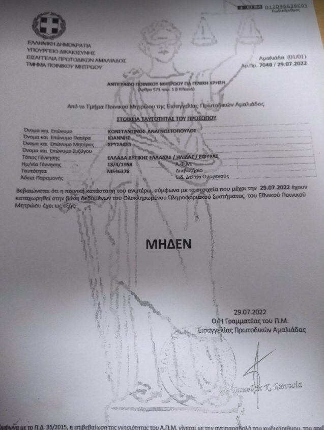 Να σημειωθεί επίσης ότι με βάση τα στοιχεία που έχουν καταχωρηθεί μέχρι τις 29.7.2022, το ποινικό μητρώο είναι καθαρό.