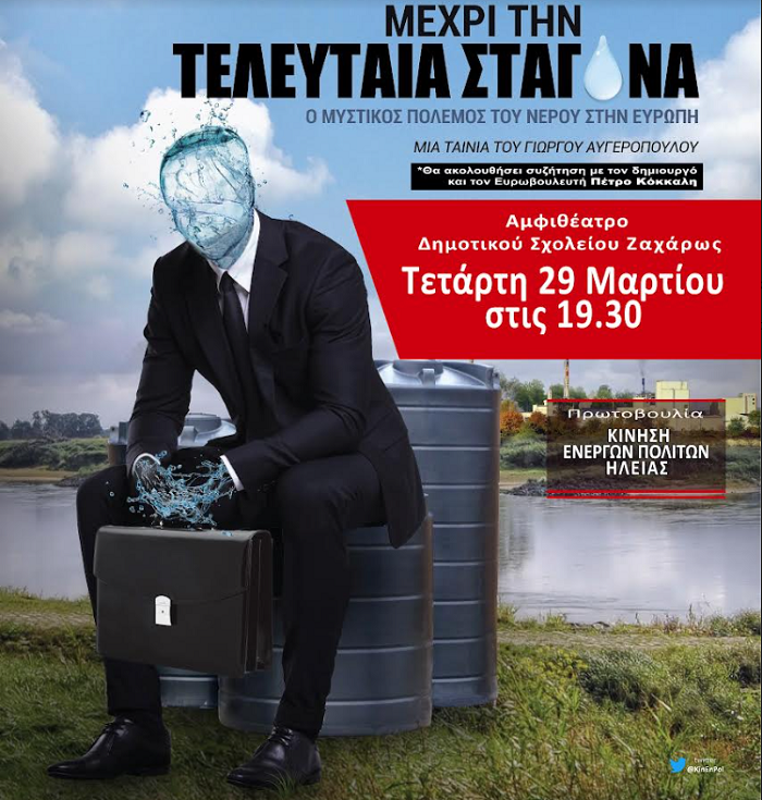 Η «ΚΙΝΗΣΗ ΕΝΕΡΓΩΝ ΠΟΛΙΤΩΝ ΗΛΕΙΑΣ» διοργανώνει εκδήλωση, σε συνεργασία με τις ομάδες «Φίλοι Καϊάφα» και «Ενεργοί Πολίτες Ζαχάρως» για την αποτροπή της ιδιωτικοποίησης του νερού που ψήφισε πρόσφατα η κυβέρνηση.
