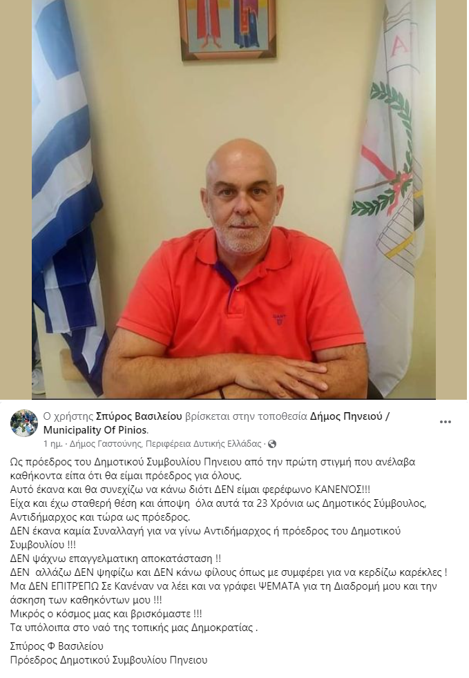 Με μπαράζ δημοσιεύσεων στο facebook, μέλη της μείζονος αντιπολίτευσης του δήμου Πηνειού προσπάθησαν να διαμορφώσουν αρνητική εικόνα κατά του δημάρχου Πηνειού Ανδρέα Μαρίνου, σε αυτούς που δεν παρευρέθηκαν για να δουν και να ακούσουν τα όσα ειπώθηκαν.