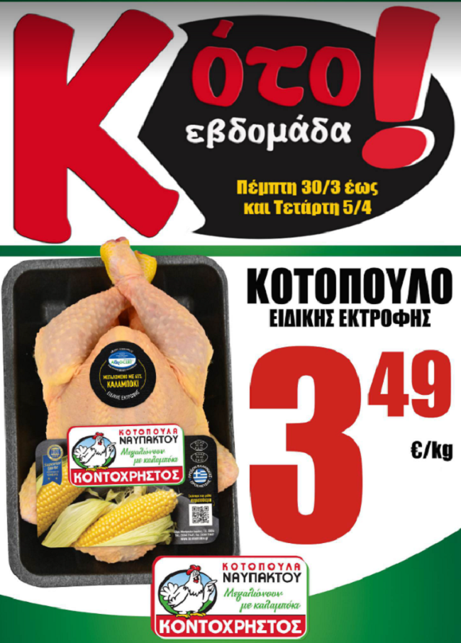 Κοτοεβδομάδα ξεκίνησε από σήμερα Πέμπτη 30 Μαρτίου και θα διαρκέσει ως και την Τετάρτη 5 Απριλίου, από τα καταστήματα “Κοτόπουλα Ναυπάκτου Κοντοχρήστος”, σε Αμαλιάδα και Γαστούνη.