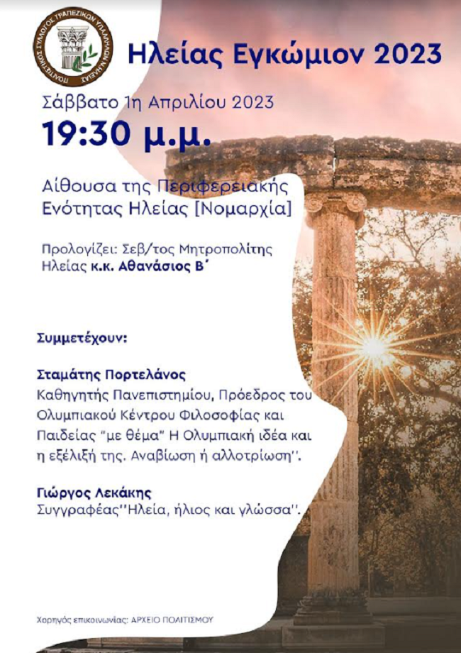 Ο Πολιτιστικός Σύλλογος Τραπεζικών Ηλείας ,θα πραγματοποιήσει,γιά ένατη χρονιά ,την εκδήλωση-αφιέρωμα στους Αρχαιολογικούς χώρους της Αρχαίας Ολυμπίας – Αρχαία Ήλιδα – Επικούρειος Απόλλωνα, καθώς και στο παρελθόν και παρόν του Νομού,στο πλαίσιο της πανελλήνιας εμβέλειας αυτής εκδήλωσης ” Ηλείας Εγκώμιον 2023” το Σάββατο 1η Απριλίου 2023 και ώρα 7.30μμ στην Αίθουσα της Περιφερειακής Ενότητας Ηλείας [Νομαρχία]