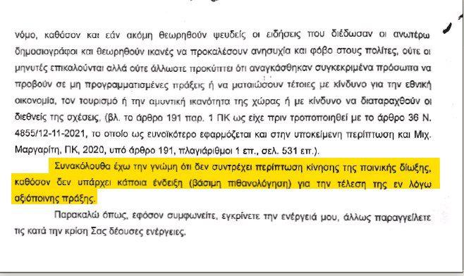 Οπως αναφέρεται στη σχετική διάταξη: «Η υπό κρίση μηνυτήρια αναφορά είναι αβάσιμη στον νόμο, καθόσον και αν ακόμη θεωρηθούν ψευδείς οι ειδήσεις που διέδωσαν οι ανωτέρω δημοσιογράφοι και θεωρηθούν ικανές να προκαλέσουν ανησυχία και φόβο στους πολίτες, ούτε οι μηνυτές επικαλούνται αλλά ούτε άλλωστε προκύπτει ότι αναγκάστηκαν συγκεκριμένα πρόσωπα να προβούν σε μη προγραμματισμένες πράξεις ή να ματαιώσουν τέτοιες με κίνδυνο για την εθνική οικονομία, τον τουρισμό ή την αμυντική ικανότητα της χώρας ή με κίνδυνο να διαταραχθούν οι διεθνείς σχέσεις».