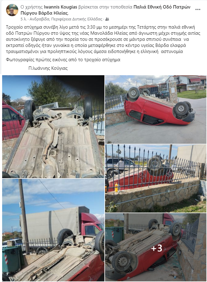 Τροχαίο ατύχημα συνέβη λίγο μετά τις 3:30 το μεσημέρι της Τετάρτης στην παλιά εθνική οδό Πατρών Πύργου στο ύψος της Νέας Μανολάδα Ηλείας. Από άγνωστη μέχρι στιγμής αιτίας αυτοκίνητο ξέφυγε από την πορεία του και προσέκρουσε σε μάντρα σπιτιού.