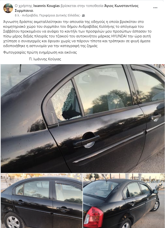 Άγνωστοι δράστες εκμεταλλευόμενη την απουσία της οδηγού ΙΧ αυτοκινήτου, η οποία βρισκόταν στο κοιμητήριο, έσπασαν σήμερα το απόγευμα το πίσω μέρος δεξιάς πλευράς του τζακιού του αυτοκινήτου μάρκας HYUNDAI, χωρίς όμως να αφαιρέσουν τίποτα αφού τράπηκαν σε φυγή όταν ο συναγερμός άρχισε να χτυπάει.