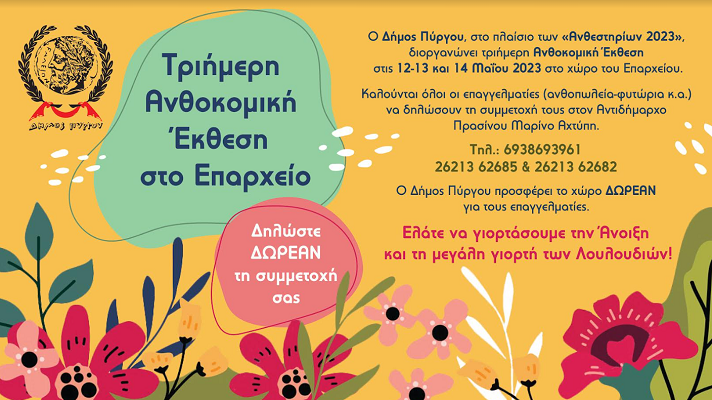 Ο Δήμος Πύργου, στο πλαίσιο των «Ανθεστηρίων 2023», διοργανώνει τριήμερη Ανθοκομική Έκθεση στις 12-13 και 14 Μαΐου 2023 στο χώρο του Επαρχείου.