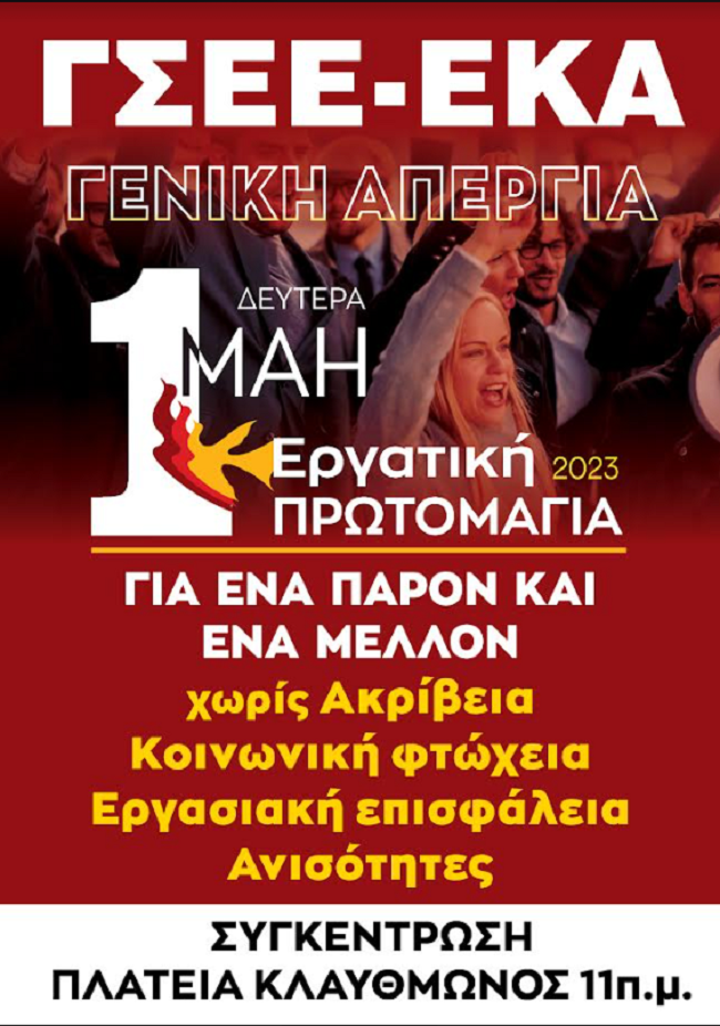 Η Πρωτομαγιά του 2023 συνεχίζει να βρίσκει τις εργαζόμενες και τους εργαζόμενους της χώρας αντιμέτωπους με την ακρίβεια, την ανεργία, την κοινωνική φτώχεια, τον περιορισμό εργασιακών δικαιωμάτων, την επισφάλεια και την ανασφάλεια στους χώρους εργασίας. Γι αυτό το λόγο αγωνιζόμαστε για ένα παρόν και ένα μέλλον χωρίς ακρίβεια, κοινωνική φτώχεια, εργασιακή ανασφάλεια και ανισότητες.