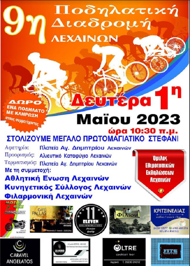 Την Δευτέρα 1η Μαΐου και ώρα 10.30 π.μ. ξεκινάμε με τα ποδήλατα από την Πλατεία Αγίου Δημητρίου και κατευθυνόμαστε στο Αλιευτικό Καταφύγιο Λεχαινών. Εκεί θα στολίσουμε όλοι μαζί ένα πολύ μεγάλο Πρωτομαγιάτικο στεφάνι που κατασκεύασε ο Ομιλος Εθιμοτοπικών Εκδηλώσεων Λεχαινών. Παρακαλούμε όποιος επιθυμεί μπορεί να φέρει λουλούδια (από τον κήπο ή τον αγρό).